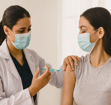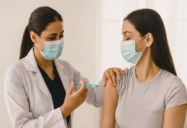 aplicação de medicamentos injetáveis e vacinas, seguindo normas técnicas específicas e garantindo um ambiente adequado e seguro.